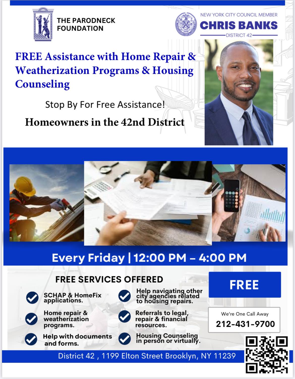 Starting this Friday March 13th 2026, and every Friday thereafter from 12 PM to 4 PM, in partnership with The Parodneck Foundation, we will be hosting office hours to help seniors who qualify; apply for home repair and assistance programs.